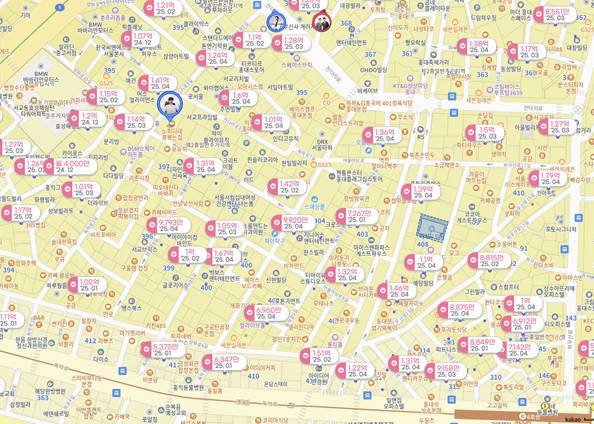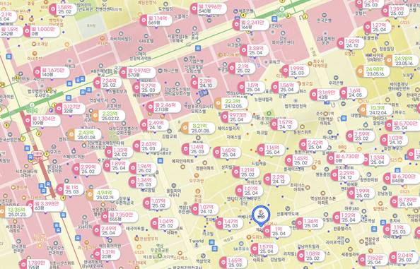 그림2. 역삼동(위)과 홍대입구역(아래) 매물 현황: 대부분 25년 3, 4월 등록