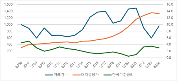 그림1. 소형 상업용부동산 거래량, 대지평당가와 한국은행 기준금리 추이