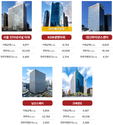 또한 KDB생명타워는 매각 주관사 선정 이후 거래가 추진 중으로, 연면적 기준 대형 자산에 대한 시장 관심을 반영하고 있다.