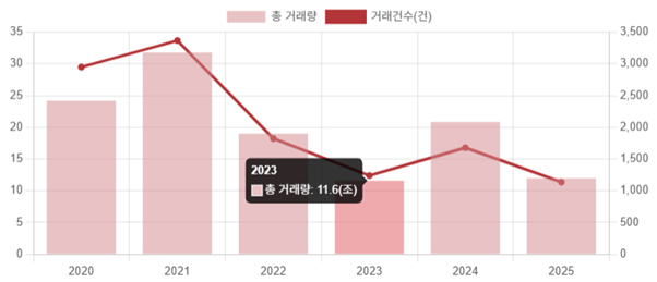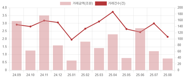 최근 5년간 서울 상업용부동산 시장은 뚜렷한 거래 위축 국면을 보였다. 2021년 약 30조 원에 달했던 거래금액은 2023년 11.6조 원, 2025년 11.9조 원(9월 30일 현재) 수준으로 축소되었다. 거래건수 역시 전월 150건에서 107건으로 감소하며 시장 유동성이 전반적으로 위축되었음을 보여준다. 금리 고착화, 기관투자자의 리스크 관리 강화, 외국인 자본 유입 둔화 등이 이러한 조정의 배경으로 지목된다.