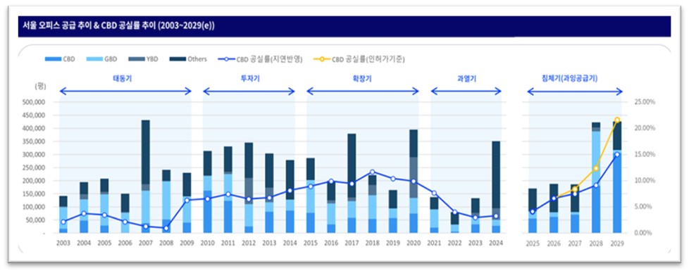 서울 오피스 시장은 2003년 이후 연평균 20~30만 평 정도 새로운 오피스가 공급되었습니다. 2020년 여의도에 파크원이 들어선 해는 서울 전체 40만평 정도 공급이 되었지만, 2021~2023년에는 15만평이 채 되지 않았고 2024년에는 마곡 등 기타권역에서 25만평 정도 신축되어 35만 평이 공급되었습니다. 지금 최근 인허가를 받았거나 착공에 들어간 사업장이 급격히 증가하여 2028년과 2029년 두 해 모두 약 40만평 이상 공급될 것으로 보입니다. 일부 자문사들의 예측은 서울 오피스 공실률은 2030년 무렵에는 CBD가 약 15% 정도, GBD는 약 10%, 여의도는 약 3% 정도 될 것으로 예측하고 있습니다.