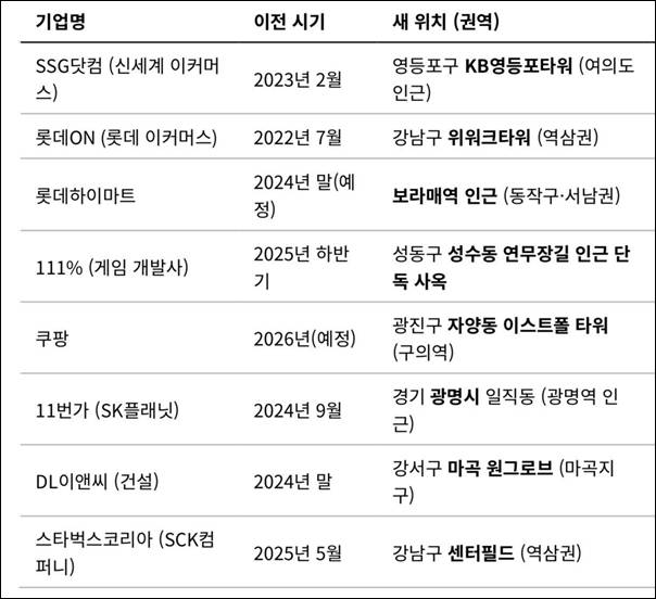 위의 표에 나타난 대로, 강남권역(GBD)의 높은 임대료 부담과 경기둔화에 따른 비용 절감 필요 등으로 여러 기업이 상대적으로 임대료가 저렴한 지역으로 본사를 이전하였다. 예를 들어 신세계그룹의 SSG닷컴은 2023년 2월 강남 센터필드에서 영등포 KB타워로 본사를 옮겨 임대료를 크게 절감했으며, 같은 신세계 계열의 스타벅스코리아도 2020년 명동 인근에서 업무공간을 확장한 후, 2025년 5월에는 SSG닷컴이 떠난 자리를 이어받아 강남 센터필드로 본사를 이전했다. 스타벅스는 임직원 증가로 인한 공간 부족과 계약 만료가 맞물리며 강남권 신축 빌딩을 택한 사례로 확인된다.
