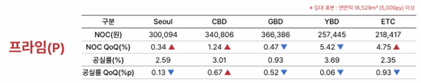 임대료(NOC)는 GBD 프라임이 권역 최상단을 지키고, CBD는 프라임만 소폭 상승했으며 YBD 프라임은 조정이 나타났다. 요컨대 프라임은 강·보합, A등급은 조정이라는 ‘질적 양극화’가 확산된다.
